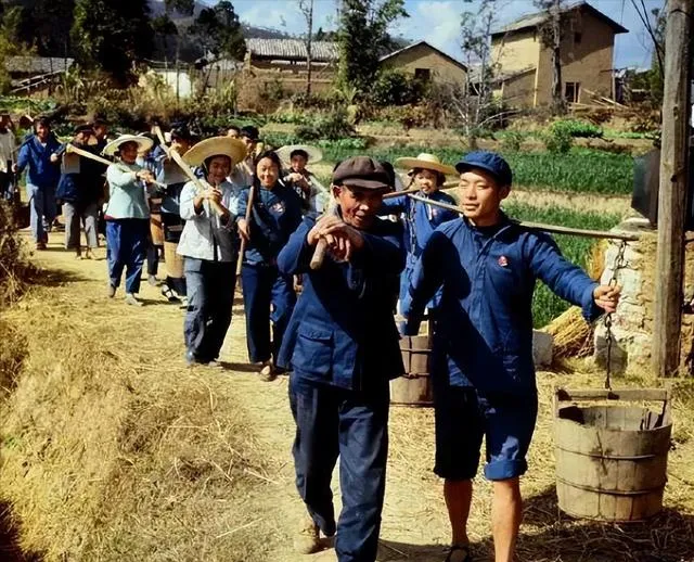 肩上挂着粗木桶,一长溜人乐呵呵地走在田间小路,天蓝云白,大家一身灰蓝补丁的衣裳,桶挂两头咯吱晃,小时候第一次帮家里挑水,大人一边走一边回头张罗:“慢点,别泼了”桶太沉走摇摆,年纪小只能装半桶,水溅裤腿还抱怨,谁家门前都有个水缸,天不亮得提前去排队,现在小区楼上自来水一拧就有,扁担和桶都去老屋墙角靠着睡觉了。
