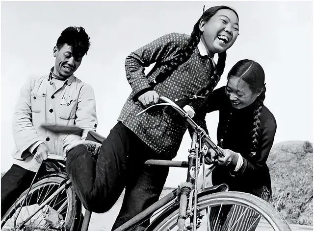 风呼呼的,两个梳麻花的小姑娘抢着骑车,旁边的小伙子推着使劲笑,彼此打趣斗气,裤腿一卷,袜子露出冻疮那几道,谁要骑一大圈不松把儿都要被大家鼓掌喊好,偶尔后座上坐俩人,都不怕摔跤,老家的老路全靠叫嚷传开消息,“快看!咱妹子骑大车啦!”