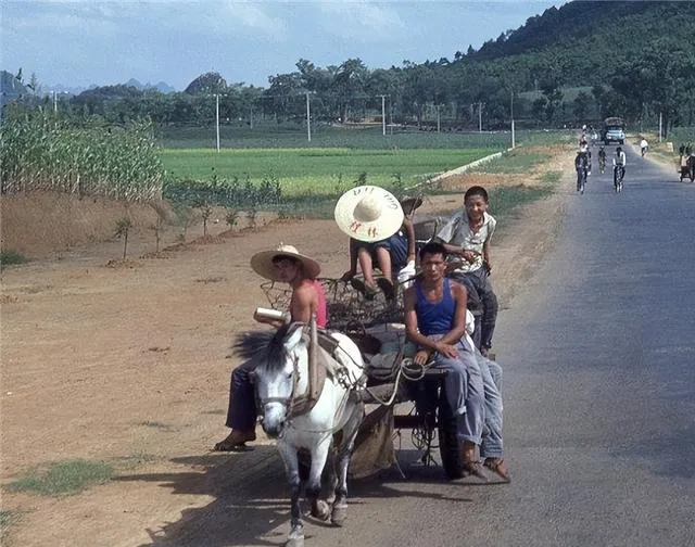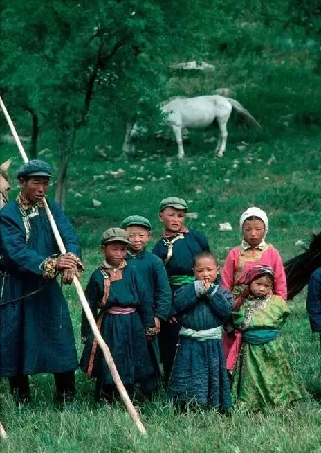 图里的这一大家子,穿着一色的土蓝和墨绿,那布料一看就是自家缝的,身上的腰带扎得利索,小孩站得紧紧的,一动不动就怕大人吼,旁边那白马也悠闲着,背景是细碎的树影,这一幕是上世纪农村常见的景儿,大人带着一群娃出来放牛放羊,哪有现在家长送孩子上兴趣班那么金贵,衣服一年只添几身,补丁接着补丁,大伙儿都一样也没人笑话谁。