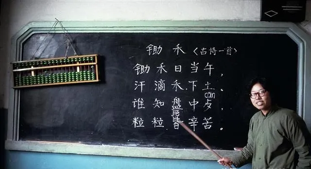 这个教室里墙头挂着一副算盘,黑板上板书工工整整,老师眼镜底下一抬手,指着那句“谁知盘中餐,粒粒皆辛苦”,小时候上课这一幕太眼熟了,教室凳子都是木头的,前排的同学被老师点名,站起来背诗,算盘摇一摇“哗啦哗啦”的声音,记账做加减法全靠它,没有电子计算器,算盘珠子拨得熟练的才叫会过日子,老师那根教鞭一敲桌子,全班都安静下来。