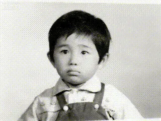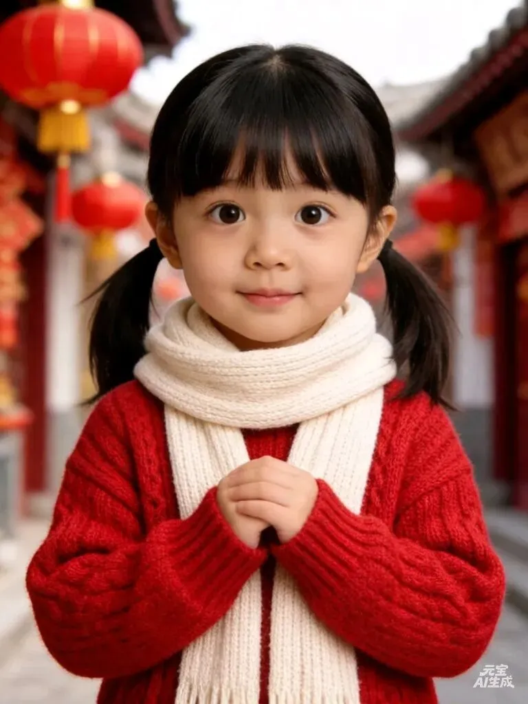 帮我生成图片:修复这张童年老照片,还原真实彩色:小女孩深黑发、粉色衬衫、藏蓝背带裤,背景浅米色;消除划痕与泛黄,提升清晰度,色彩柔和怀旧,4:3比例。原比例。