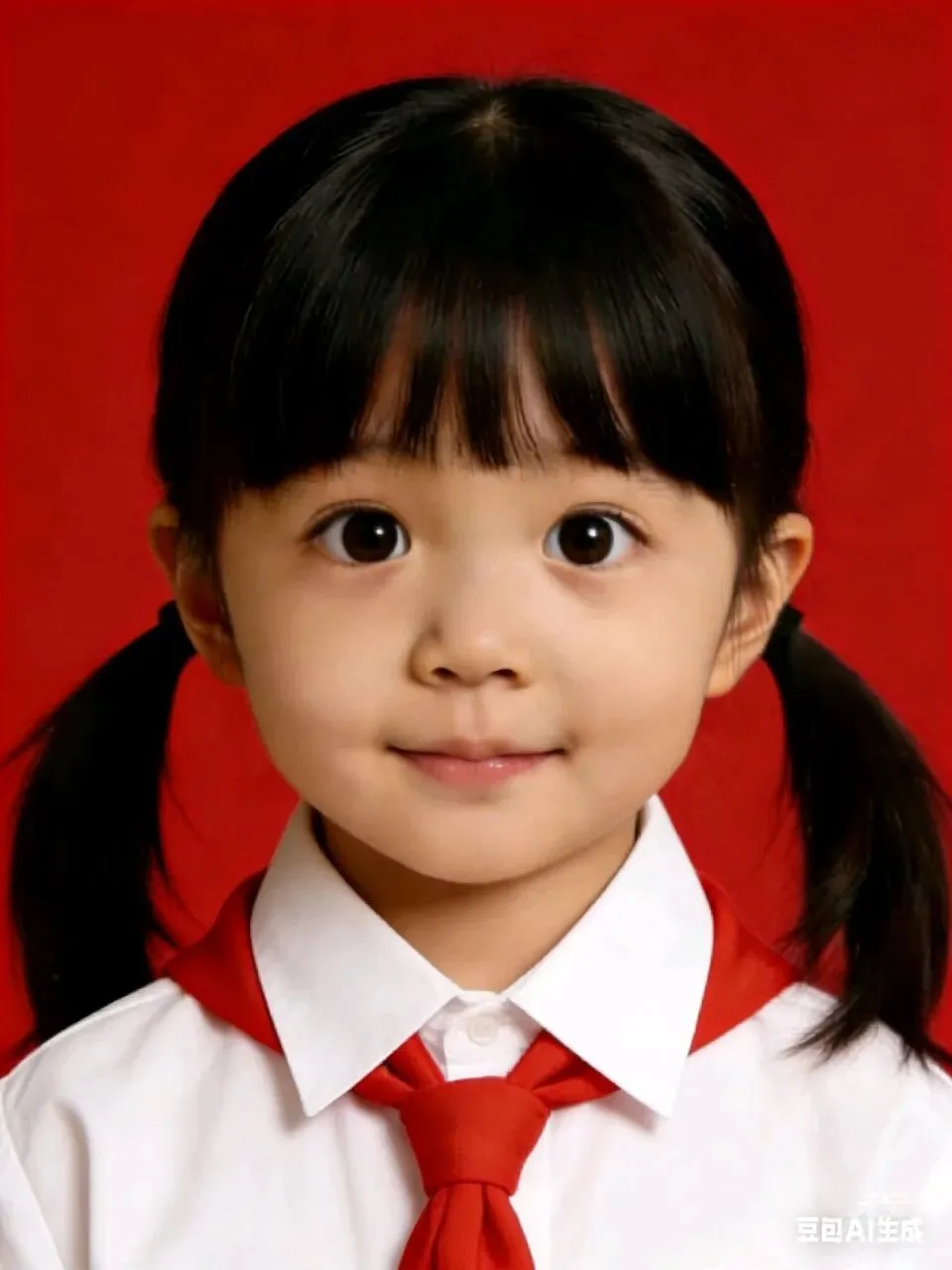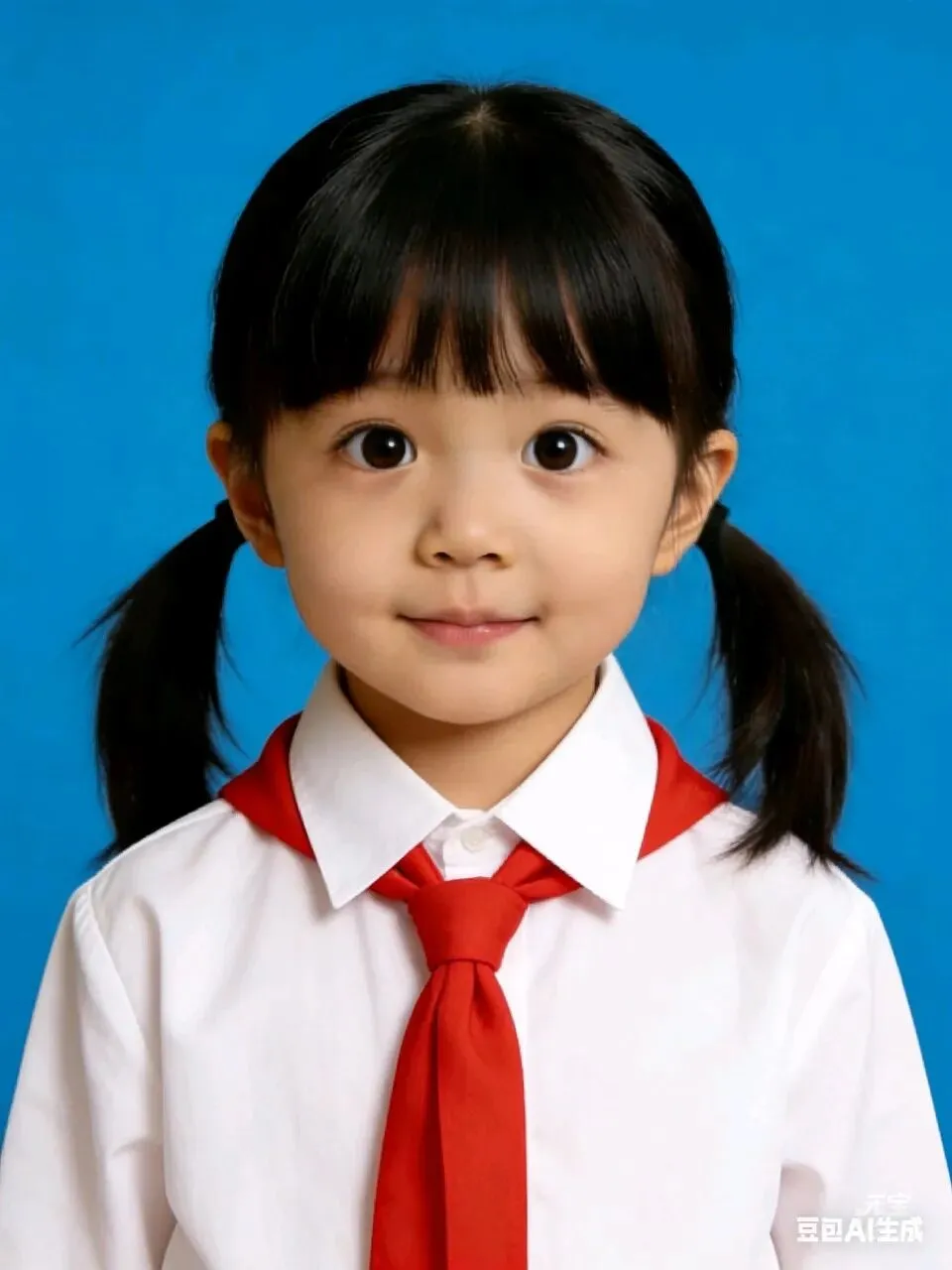 帮我生成图片:双手自然下垂,衣服换成白衬衣红领巾。原比例。