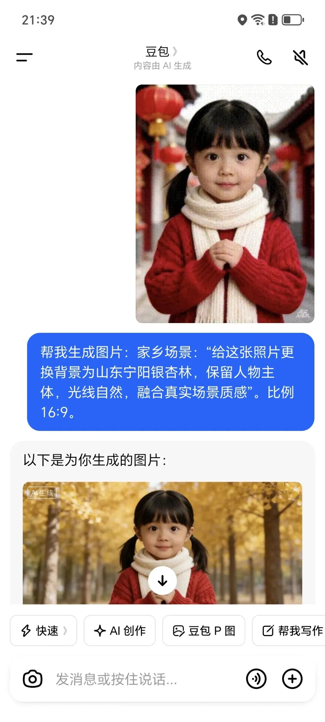 - 家乡场景:“给这张照片更换背景为山东宁阳银杏林,保留人物主体,光线自然,融合真实场景质感”