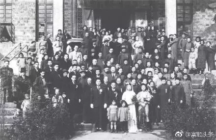 20世纪40年代富顺(自贡)“盐商家庭”的婚礼留念,挺括、得体的西装,精细、合身的中式旗袍,表明了新郎新娘充裕的家境与良好的受教育程度。近百至亲好友与嘉宾,则显示出男女双方两大家族的人丁兴旺与社会地位。