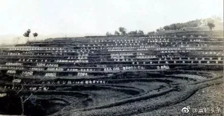 大跃进中,富顺县瓦市区蔚为壮观的山坡标语阵。