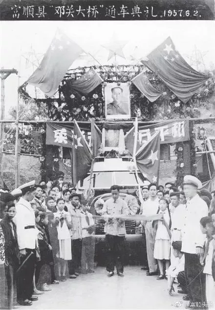 1957年6月2日邓关大桥通车典礼。邓关(邓井关的简称)大桥坐落于釜溪河下游,距沱江入口两公里,横跨釜溪河东西两岸,全长160余米。邓关大桥的建设始于新中国过渡时期的结束阶段,落成于社会主义建设新的时期,在这个意义上,它也是富顺的一座历史之桥。