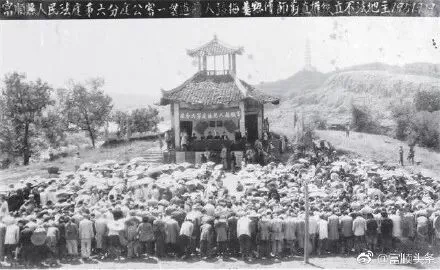 公审“一贯道”门徒及不法地主。1950年5月25日,富顺县人民法院成立,11月成立县人民法庭。1950年7月,中华人民共和国中央政府宣布“一贯道”属于反动会道门的组织,予以取缔和打击。1951年7月,富顺县人民法庭第六庭召开公审大会,审判反动会道门一贯道门徒以及不法地主。图为在罗浮洞广场举行的宣判大会现场。