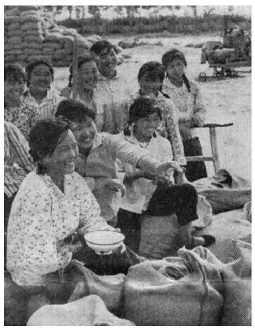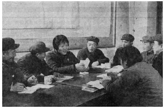 共中央委员、辽宁省革委会副主任、东北机器制造厂女工尉凤英(左三)和她原来所在车间的党支部成员,交流学习马克思著作《法兰西内战》的心得体会。