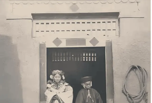 大哥大姐们,这张照片瞅着就让人心里发毛,这就是清式婚礼的样子,新娘子披着大红盖头,身上的褂子压得她腰都直不起来,新郎官穿着长袍马褂,俩人站在门前跟木头人似的,门楣上那些木格子密密麻麻的,墙边还挂着绳套,那时候成亲可不像现在这么热闹,讲究的是规矩和吉利,俩人低着头不敢说话,就等着拜堂那一刻,现在想想这婚礼氛围确实够惊悚的,但这就是那个年代的体面。