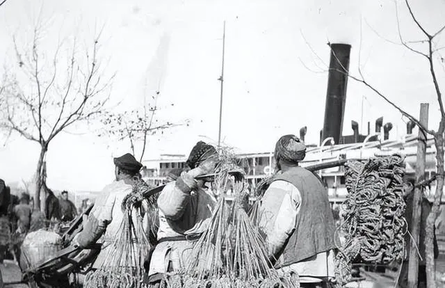 这张照片里的汉子挑着扁担卖草鞋,身后是冒着黑烟的轮船,那时候码头上最常见的就是这种挑担子做小买卖的,草鞋一串串挂在扁担上,十来个铜板就能买一双,穿上就能赶路,我爷爷说他小时候脚上的鞋底磨破了,就在码头上买双草鞋继续走,现在鞋店里的鞋花样多得眼晕,可那股子踏实劲儿却找不回来了。