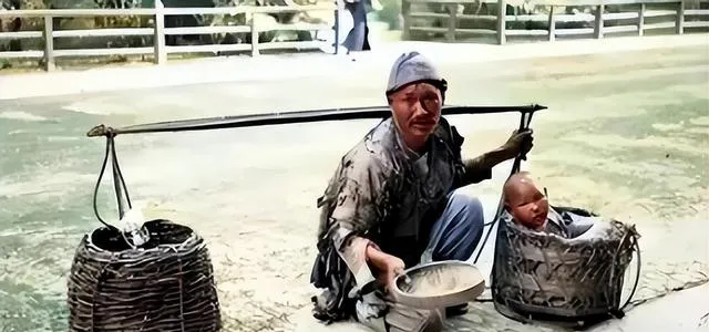 这个弯腰的汉子左边篮里锅碗瓢盆右边篮里襁褓孩子,肩上扁担磨得发亮手里端着破碗,带着娃行乞的日子有多难只有过过的人才知道,我妈妈说路过会塞两块饼,说孩子小心里过不去,现在城市灯亮得很人却容易看不见彼此的难处。