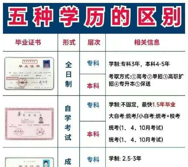 这张表格叫五种学历的区别,横竖分明字里行间全是门路,哪年考几年读拿什么证一目了然,表格是新的味道却有点像过去挑担过门牌,事儿多但好对照,现在问路靠导航以前认字认章认印,差不离一个理儿。