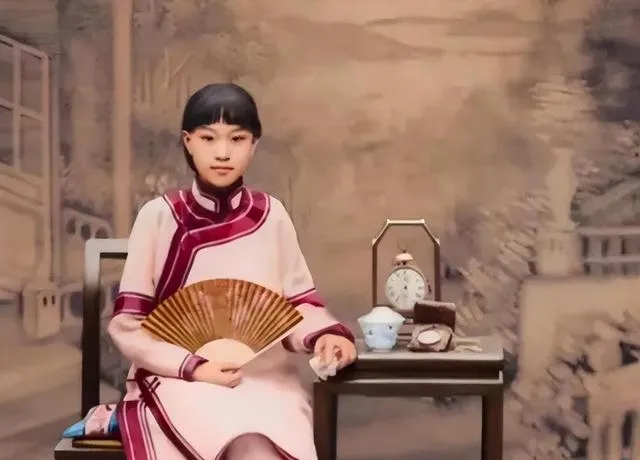 这位端坐的姑娘手里折扇铺开,桌上茶盅时钟台灯摆成一溜,光打得柔和眉眼干净,民国闺秀的从容劲儿都在这一张照片里了,我小时候第一次进照相馆师傅掐着表叫我别眨眼,我偏偏憋不住笑,这样的质感现在滤镜盖了也找不回来。