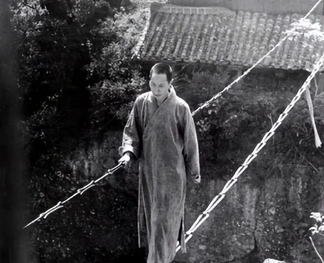 这个场景里的人走在铁索上,叫做索桥,链扣一节一节,脚掌踩上去就微颤,僧袍垂直,手里拄着根细棍子,风从山坳里过一口一口地吹,胆子要大,步子要稳,我外公见过这样的桥,说第一次过桥时把腰带往旁边树上一绕,心里才不慌。