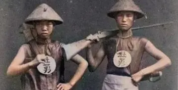 这对少年的牌子上写着“壮勇”,土帽一扣,火绳枪扛在肩上,站姿生硬,脸却稚,乡团操练多半这样,家里人说“有胆啊”,转头又嘀咕“孩子呢”,那阵子刀枪在手,不见得就有底气。