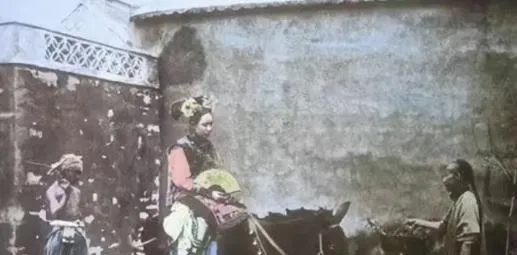 这张路口的照片里,女子坐在驴背上扇子遮脸,旁边跟着驴夫和看门差役,没见到什么华丽的轿帘,倒是墙角的青苔看着冷,这一路不唱不笑,脚不着地反而更显孤单,以前说“烟花地”,现在看明白大多是“烟”没有“花”。