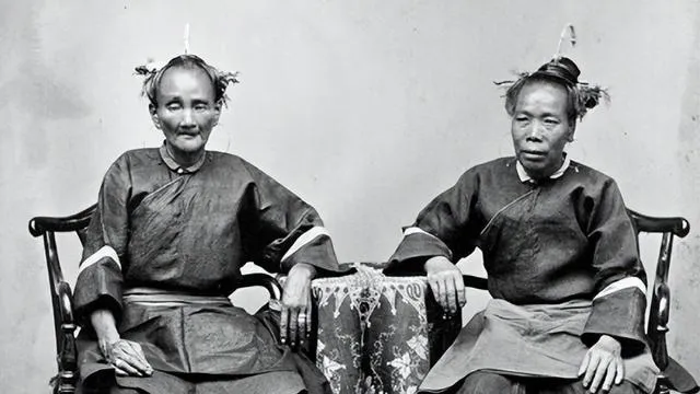 两个坐在木椅上的妇人,一个裹了小脚,一个没裹,发饰、领口、褶摆都不一样,差别不必多说,走起路的姿势就知道了,过去人说“各从其俗”,落在身上却是疼不疼的事。