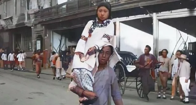 图里这位被肩扛着的女孩年纪小,手脚收得紧,旁边车夫探头瞧,路面坑洼,尘土糊在脸上,一桩生意走完就散,谁也不提名字,谁也不问从哪来往哪去。