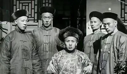 这张合影里中间坐着的穿蟒袍,左右站的人太阳穴鼓起,站得板直,一看就知是练家子,门窗花格在背后,影子压在地上,威严不是吼出来的,是静出来的。