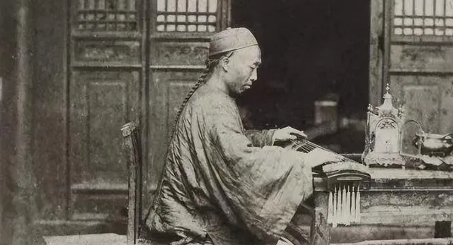 这位案前的人弹的是古琴,指尖按弦,眉心拧着,旁边一盏小钟摆件静着不动,屋外有人走过,脚步声被琴声压住,听不见了,琴这东西,一按就是一段心事。