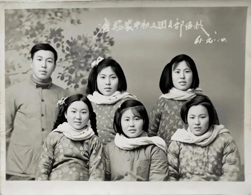 照片边缘已经磨损,画面带着老相纸特有的颗粒感,六个年轻的面孔挤在镜头前,穿着厚厚的冬衣,围着朴素的白围巾,眼里带着属于那个年代的、干净又明亮的笑意。