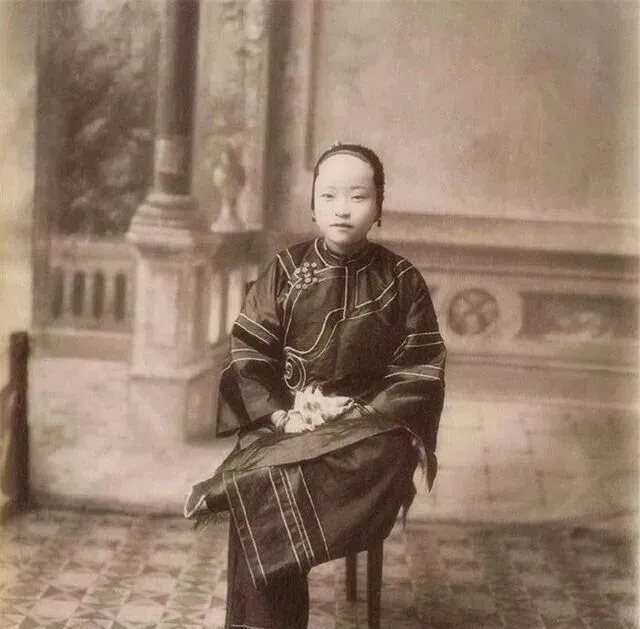 这个坐着的姑娘叫典型的闺阁照,衣襟滚边细密,袖口压线整齐,脚却紧紧并着,裙摆特地盖住脚背,照相先生懂行,镜头角度只留小半个鞋尖,既显“端庄”,又不露“真相”。