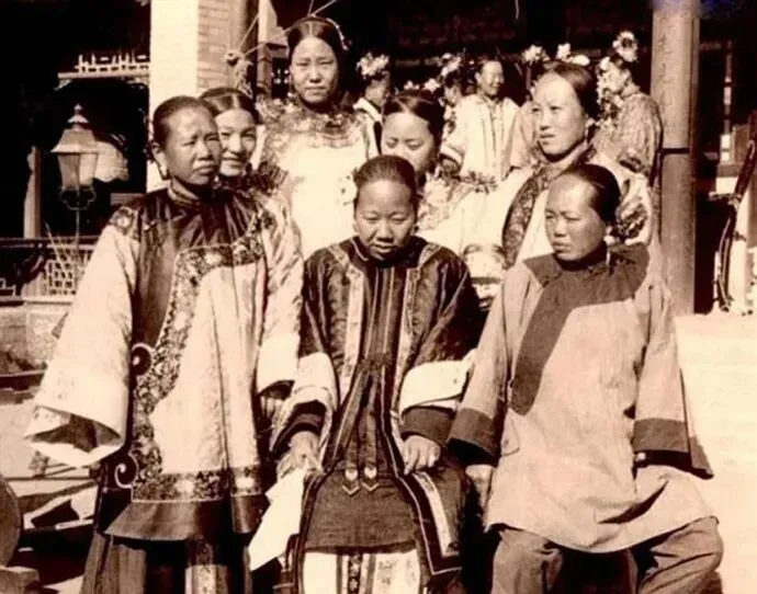 这张合影里,眼尖的能看到中间几位把脚藏在衣摆里,怕露形状,旁边的大姐脚步外八,站位靠边,群像里也能分出谁裹了脚,谁是放脚的,彼时的“门第”和“规矩”,常常就系在这几寸布上。