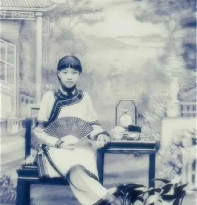 这张泛蓝的相片里,少女执扇,桌上有座钟,时髦是时髦,脚却还是小鞋,时代在变,脚下的路却没换,唉,这就是矛盾。