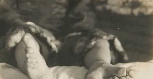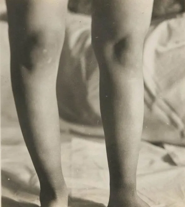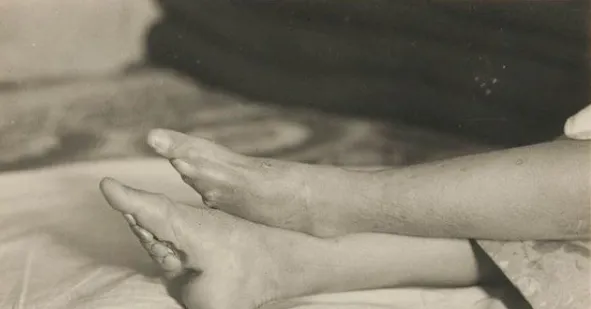 图中这对小腿看着匀称,再往下就是坍陷的脚背,裹脚不是一下子完成的,要从四五岁起,先把脚趾往掌心折,用布一层层缠紧,等骨头“听话”了,再往上勒脚背,越早越“成形”,听着就发怵。