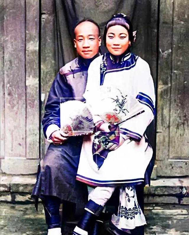 图中这对夫妻坐得端端正正,桌子边还搁着一只茶壶,衣裳是灰蓝色的大褂,领口圆圆的,女人一手搭在膝盖上,神气里透着一点紧,男人眼睛正盯着镜头,有点拿不太准主意的样子,那会儿拍照可是个大事儿,街坊都得提前一天准备,衣服找干净点的,家里老人还得叮嘱别乱动,看这架势,估计是托人跑了镇里的照相铺才弄出来的。