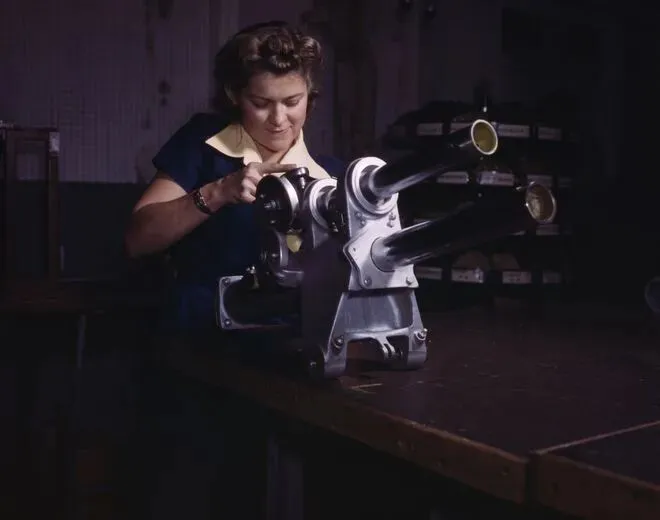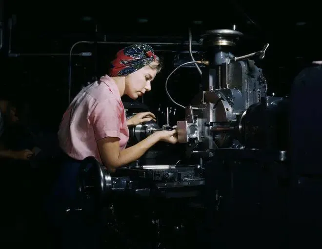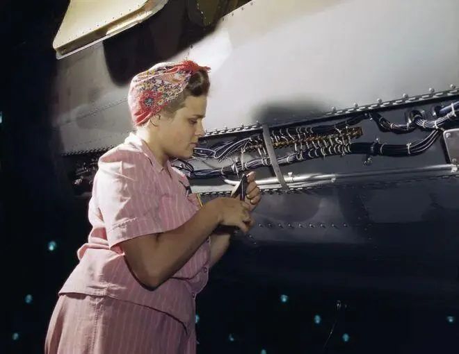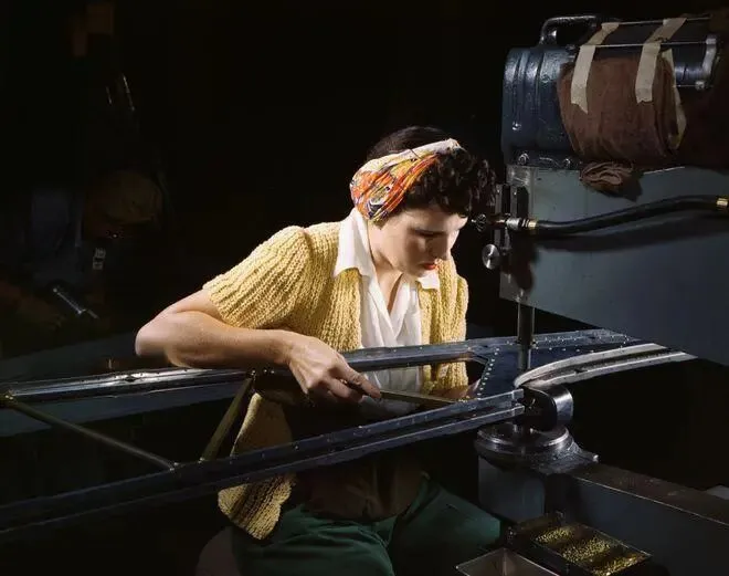 1941年12月7日,日军偷袭珍珠港,美国就此卷入了战争。战争爆发后,美国男人走上了战场,而美国女人也没闲着,走入了军工厂,成为了一名产业工人。