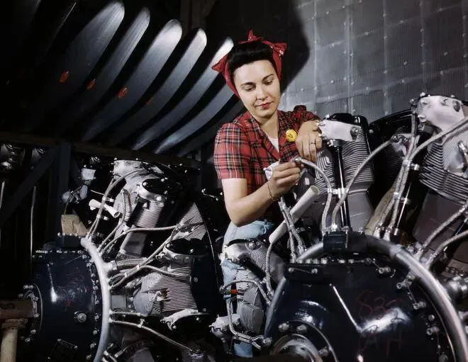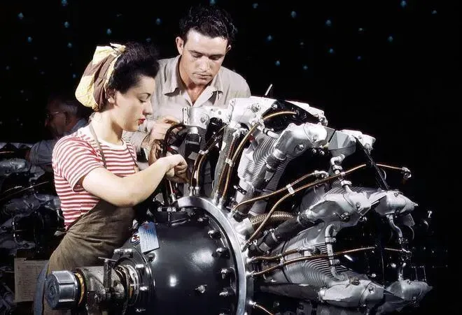 1942年6月,美国加利福尼亚州一家北美航空工厂的飞机发动机上工作的美国女士。