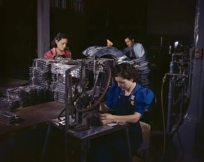 1942年10月,美国加利福尼亚州长滩道格拉斯飞机公司工厂,一名女子正在铆接机翼肋骨,随后将其放入B-17F飞行堡垒轰炸机中。