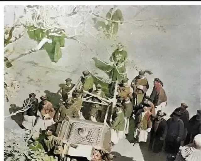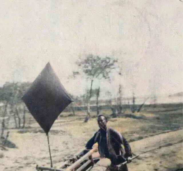 图中这顶罩着网格木篷的轿子叫肩舆,四根立柱捆得结实,顶心一个圆钮亮得生硬,周围一圈披大氅的侍卫把目光都甩向外头,帽沿压得低低的,像是随时要扑出去看风向,拍照的人躲在高处歪着角度探下机位,像猫头从窗缝里伸一下,老辈人常说那会儿风声紧,敢正面举机子就跟不要命似的,这一张糙,可真。