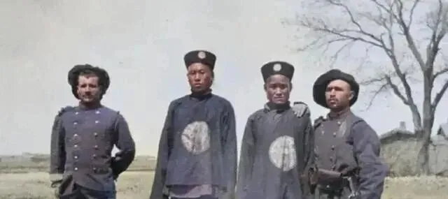 这张里左边是洋兵,腰间别着枪套,纽扣一排亮到扎眼,右边仨清朝巡捕穿布面官衣,胸口补子白得发灰,个子不矮,神气却短了半截,肩有点塌,手也不晓得往哪儿搁,那年月一站一起,底气就能看出差半口气。