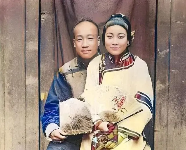 看这对,男女各执一把团扇,肩挨着肩坐着,男人气色红润,女人眼角带笑,衣料是亮面缎子,一冷一暖配得巧,在那个年月,夫妻这样坐镜头前不多见,人心向暖,总会往外透,一点温柔不用讲理。