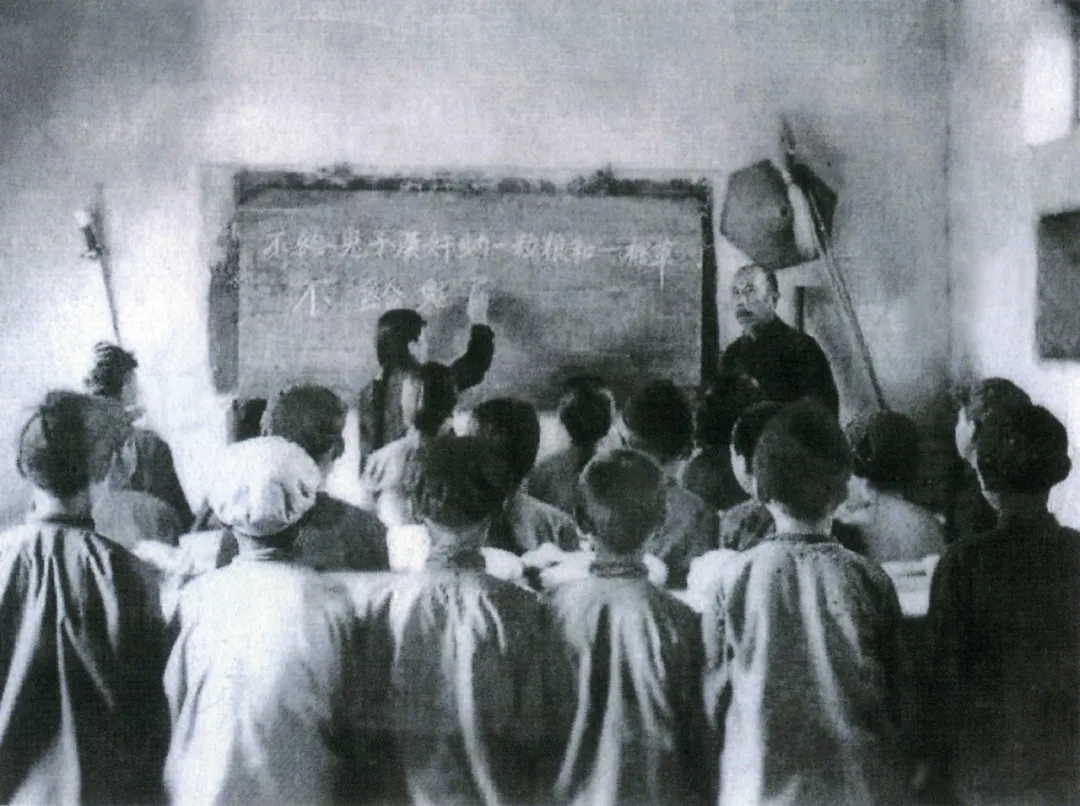 1941年任瑞卿(右一)讲课,进行抗战教育。(党史研究室 / 提供)