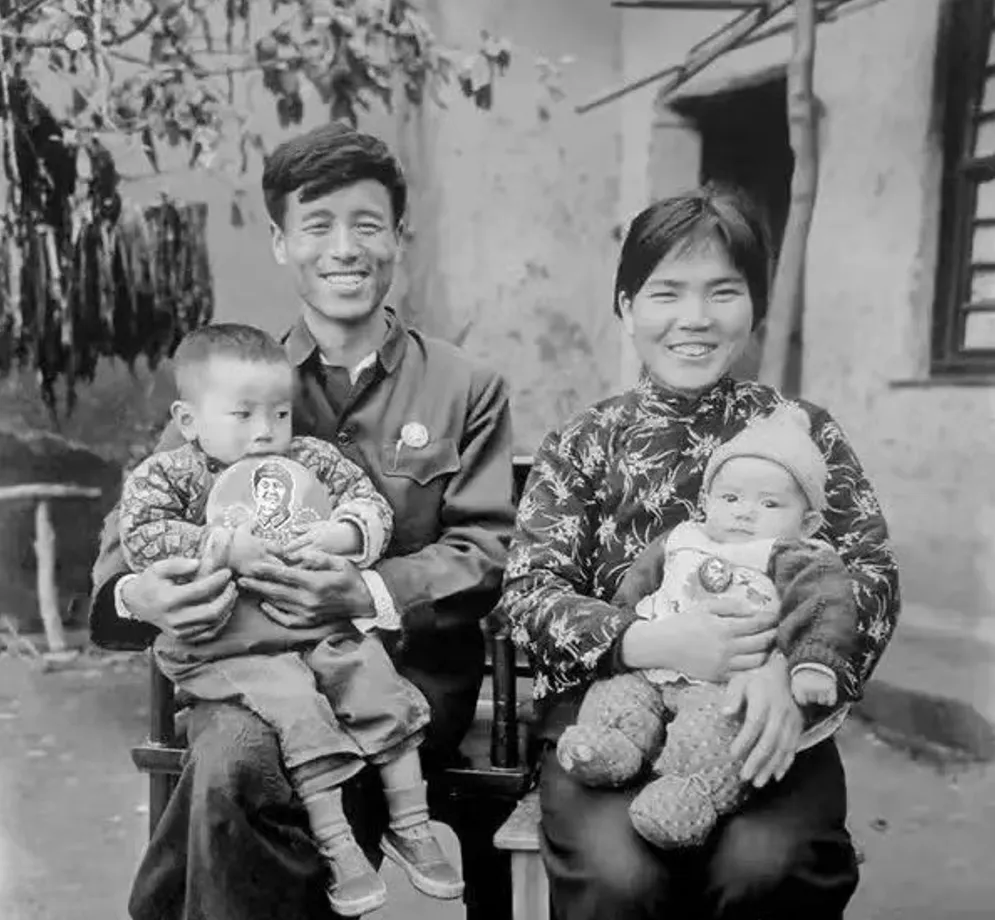 院子里的老树枝桠斜斜探入画面,背景里的土坯墙与木窗,是西安城最常见的民居模样。没有精致的布景,没有华丽的衣裳,却有着最动人的生活质感——那个年代里,一家人紧紧相依的底气,是对领袖的崇敬与对生活的热爱交织的温度。