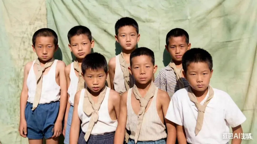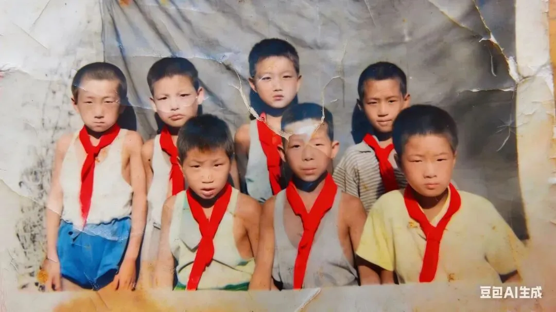 照片里每个人都表情凝重,像是要把所有的那个年代都装进这个方框里,带着它走向各自的人生。底片是黑白的,下边这张是AI合成上色。大家看看都能认出是谁吗?