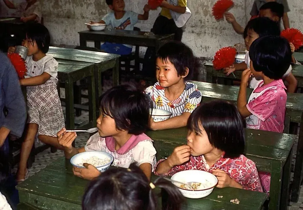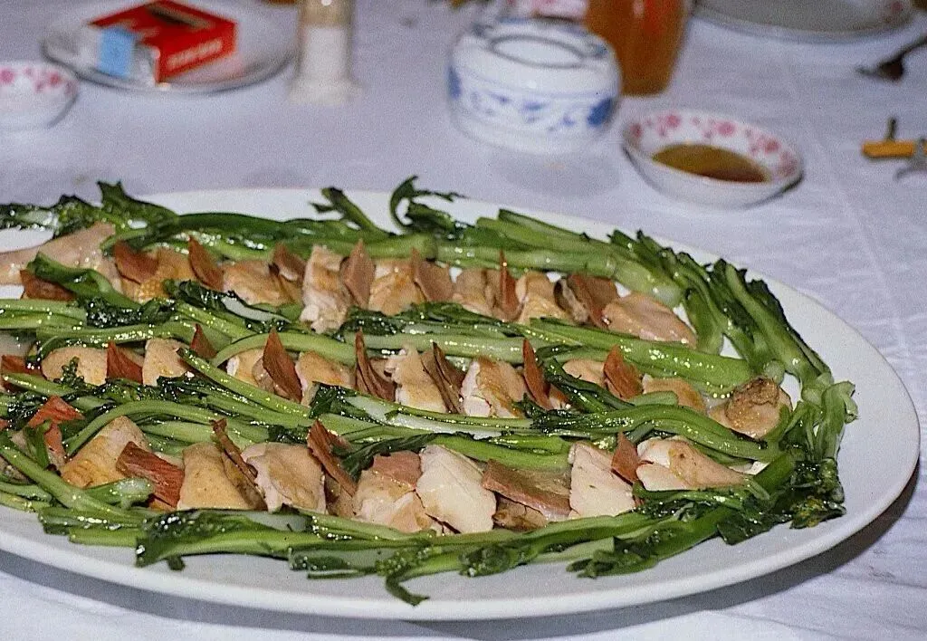照片中藏着老广的生活细节,镌刻着时代痕迹。当时的学生多从家中带米到学校,在食堂自行煮饭,大多时候只能配着简单的咸菜,能吃上一份青菜已是难得;沿江路的黄昏,下班的工人骑着自行车穿梭,道路两侧尚未有高楼遮挡,夕阳洒在江面上,与行人的身影交织成一幅踏实的生活画卷;北园酒家作为当时的知名食肆,叉烧乳猪、彩凤大拼盘是宴席上的硬菜,餐桌上摆放的红双喜香烟,成为老广州宴席的经典标配,承载着一代人的味觉记忆。