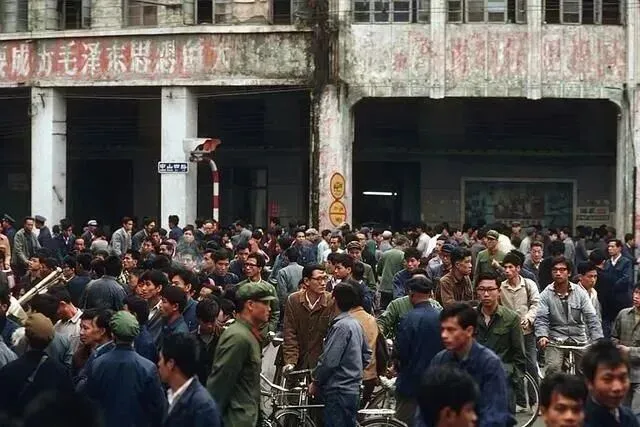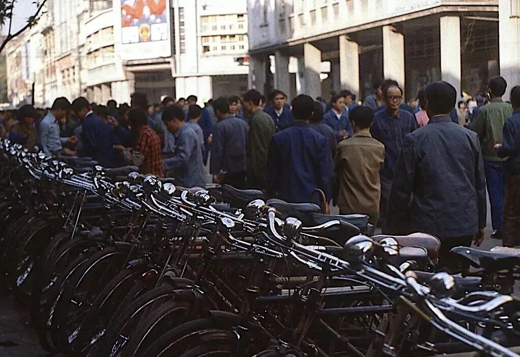照片中的1979年广州,每一幕都充满市井烟火。中山路、解放路作为当时的核心商圈,道路两旁停满了自行车,行人多身着灰、黑、白三色中山装,偶尔有几位女士背着从香港传入的洋包,成为街头一道时髦风景;解放南路的早市上,老广们排着长队购买肠粉,蒸腾的热气裹着米香,旁边的活禽摊位前,商贩与顾客的议价声此起彼伏,尽显岭南市井的鲜活。解放路沿线既有广东迎宾馆等老建筑,也有新兴小商铺,见证着城市的变迁。