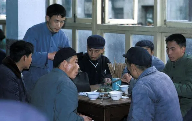 这张是国营饭店食堂饭桌,男男女女端着搪瓷碗,挤在一桌合个影都不在意,桌旁都有穿着布褂子的青年职工,菜码不大,米饭冒着热气,一群人你夹我推,有时候没筷子了抓着馒头蘸点酱油,也能呼噜呼噜吃一顿饱,过节有肉算稀罕事,饭票自主拿,谁也占不了便宜,吃完拍拍肚子往工厂跑。