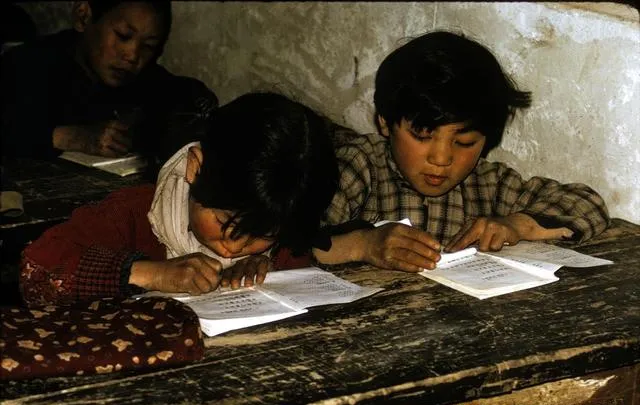 这画面太熟了,木桌和课本,两个小孩扒在桌边写字,笔头都快怼穿本子,桌面坑坑洼洼有刻字,全班人都用一个橡皮,小半截分了三家,卷着袖口还怕擦破了,那会大家新书新笔都轮不上,只想写工整点给老师看,冬天手指冻得直哆嗦,夏天汗水掉下来后背一片湿,最怕的是突然老师过来让你站起来读答案。