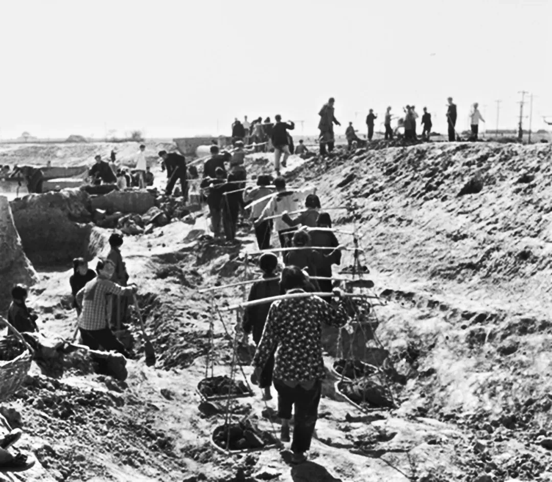 1974年,永隆沙的女知青挑担,开河工地上人山人海。翟秀玲供图