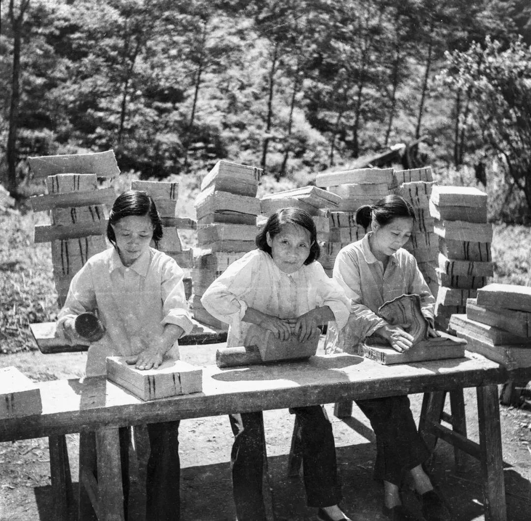 20世纪90年代,漳河源古法造纸作坊妇女们牵纸。朱明儒摄