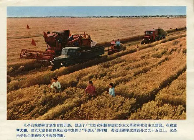 1975年的河北乐亭县,正处于计划生育政策推行的关键时期,于是就有了这样一组老照片,大力宣传晚婚和计划生育。老照片通过具体场景还原70年代农村的生活面貌和计划生育宣传的实际情况,呈现特殊历史时期的真实画面。70年代河北乐亭县晚婚和计划生育的开展,促进了广大妇女积极参加社会主义革命和社会主义建设,在普及大寨县的群众运动中发挥了”半边天“的作用,劳动出勤率达到百分之九十五以上。这是乐亭县小麦获得大丰收的情形。