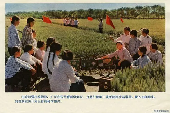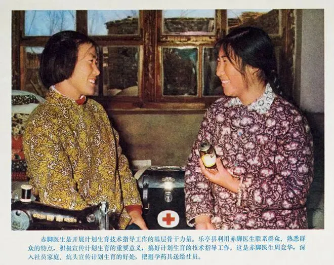 这是赤脚医生周竞华,深入社员家庭、炕头宣传计划生育的好处,把避孕药具送给社员。