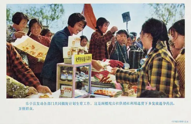 乐亭县发动各部门共同做好计划生育工作。这是阁楼坨公社供销社利用送货下乡发放避孕药具。