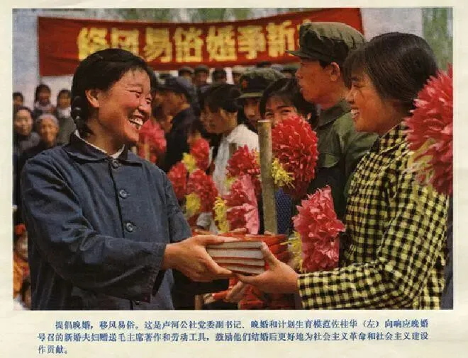 提倡晚婚,移风易俗。这是卢河公社党委副书记、晚婚和计划生育模范佐桂华(左)向响应晚婚号召的新婚夫妇赠送毛主席著作和劳动工具,鼓励他们完婚后更好地为社会主义革命和社会主义建设作贡献。