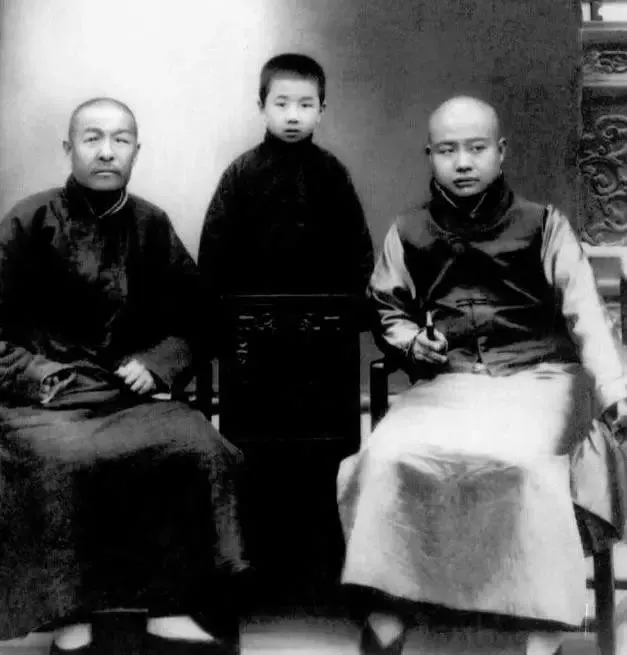 11岁的启功(中)和祖父裕隆(左)以及姑姐丈在一起。这是目前发现的启功最早的一张照片。